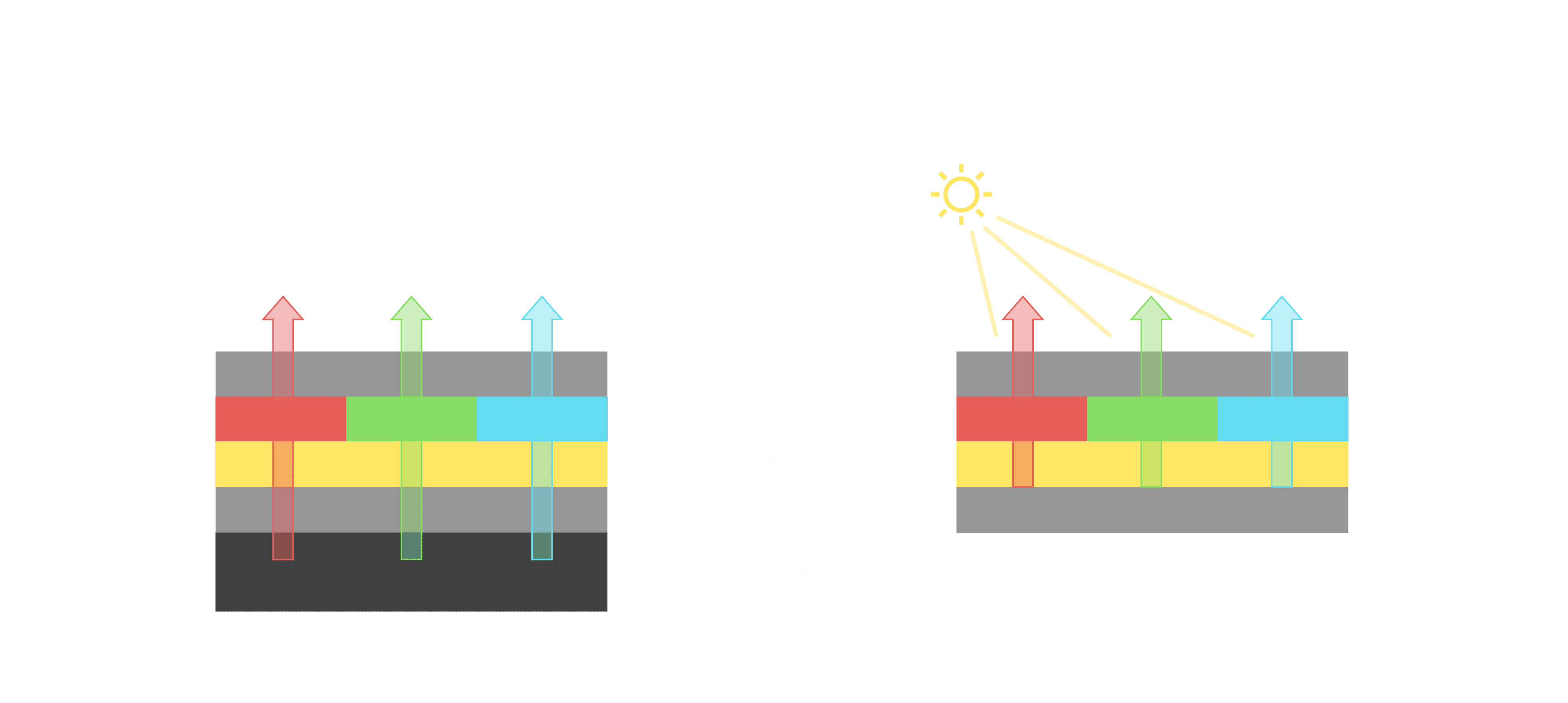 与传统需搭配背光单元的液晶显示相比,,反射式液晶技术不仅更省电、、更轻薄,,,,且即便在艳阳下仍能清晰显示。。。此外,,,少了背光单元,,,,也大幅降低了 LED 蓝光伤害眼睛的疑虑。。。